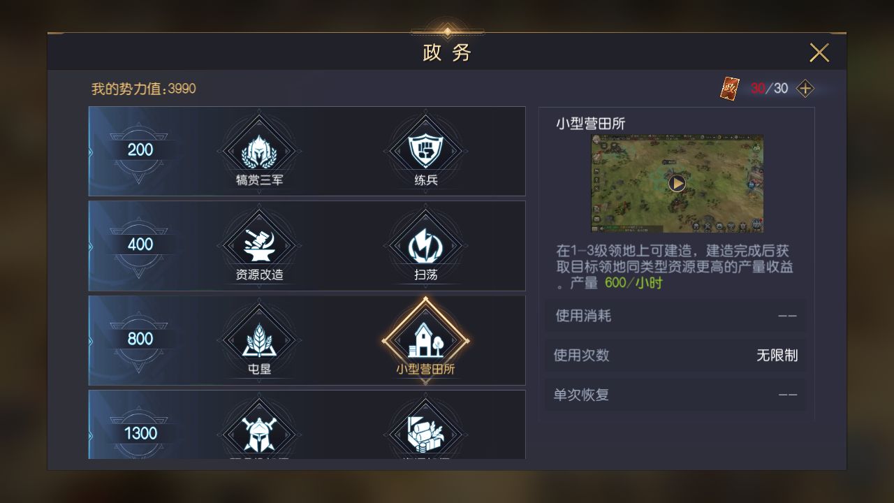 占地是提升势力值和提升资源产量的最直接方式,所以第一步就是要攻占土地。建议一直保持能攻占的最高土地等级,例如当部队能开3级地时,就尽可能开3级地,并且把之前所占领的1、2级地放弃,替换成3级地,这样能够尽可能快速地提升势力值和资源的产量。而且,建议在选择土地种类的时候尽量多选石料,因为前期对于石料的需求特别大。
