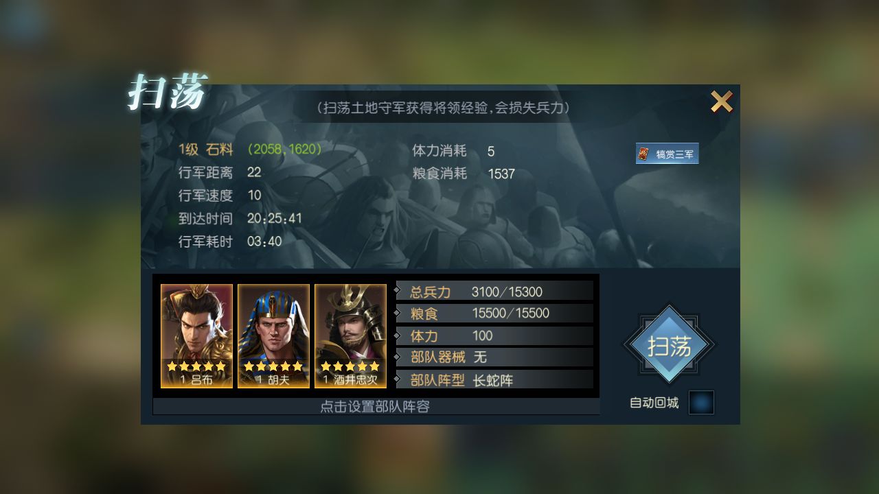 对已攻占的沙盘,玩家还可以选择执行【扫荡】政务。派遣部队到相应的资源点进行土地扫荡,这样也可以获得经验值。经验值的数值也和领地等级有关,所以小伙伴们尽量选择高等级的资源地进行扫荡,可以获得高额的经验。扫荡也相当于发生战斗,也会损失兵力,所以要记得及时补充兵力。