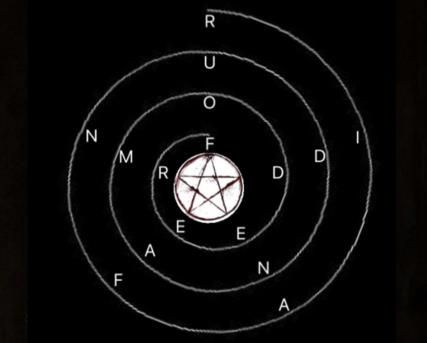 从五芒星的任意一个角开始将freedom and unfair顺时针或逆时针以漩涡方式旋转填写,根据英文提示由开始字母f到结尾字母r竖直方向为单词four。